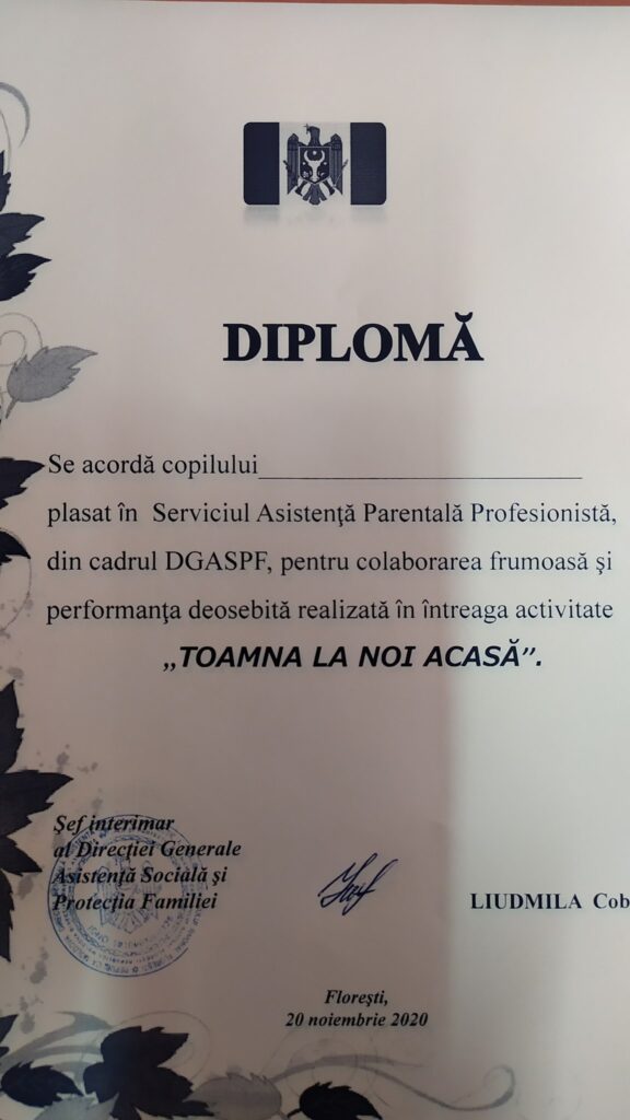 Creațiile acestor copii au fost apreciate și menţionate cu diplome semnate de către dna Liudmila Cobzac, șef-interimar al Direcției Generale Asistență Socială și Protecție a Familiei.
